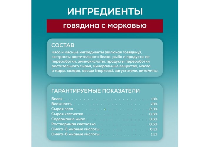 Состав СОСТАВ Мясо и мясные ингредиенты (в том числе говядина), экстракты растительного белка, рыба и продукты ее переработки, продукты переработки растительного сырья, аминокислоты, минеральные вещества, масла и жиры, овощи (морковь), загустители, сахара, витамины. ДОБАВЛЕННЫЕ ВЕЩЕСТВА: МЕ/кг Витамин А: 1230; витамин Д3: 172; витамин E: 325; мг/кг: железо: 14; йод: 0.42; медь: 1.1; марганец: 1.9; цинк: 20; таурин: 580. ГАРАНТИРОВАННЫЕ ПОКАЗАТЕЛИ Влажность: 78%, белок: 13%, содержание жира: 3.6%, сырая зола: 2.3%, сырая клетчатка: 0.6%.