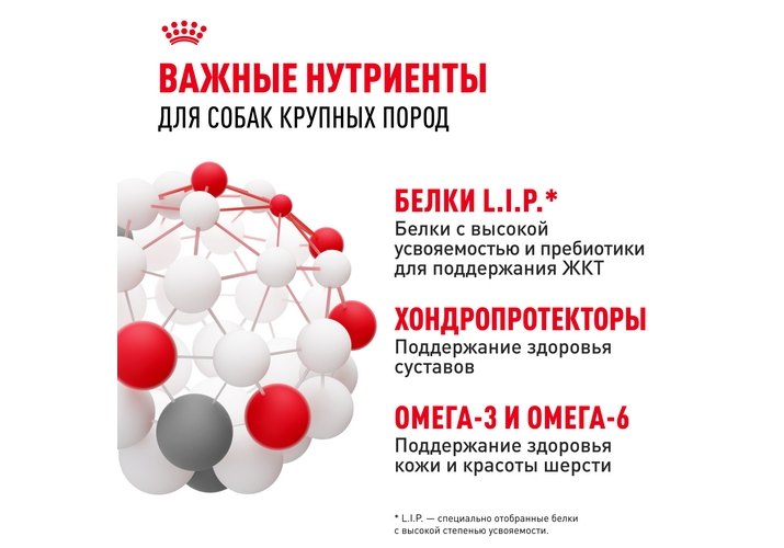 Из-за большой массы тела кости и суставы крупных собак подвергаются серьезным нагрузкам, поэтому им необходима дополнительная поддержка. ROYAL CANIN® Maxi Adult (МАКСИ ЭДАЛТ) обогащен хондропротекторами (глюкозамином и хондроитином), что поддерживает здоровье суставов.