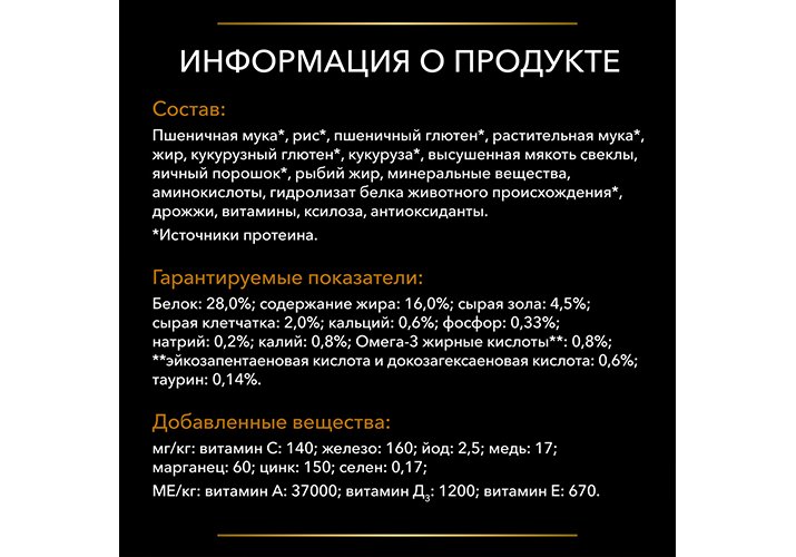 Состав Пшеничная мука*, рис*, пшеничный глютен*, растительная мука*, жир, кукурузный глютен*, кукуруза*, высушенная мякоть свеклы, яичный порошок*, рыбий жир, минеральные вещества, аминокислоты, гидролизат белка животного происхождения*, дрожжи, витамины, ксилоза, антиоксиданты. *Источники протеина ГАРАНТИРОВАННЫЕ ПОКАЗАТЕЛИ Белок: 28,0%; содержание жира: 16,0%; сырая зола: 4,5%; сырая клетчатка: 2,0%; кальций: 0,6%; фосфор: 0,33%; натрий: 0,2%; калий: 0,8%; Омега-3 жирные кислоты**: 0,8%; **эйкозапентаеновая кислота и докозагексаеновая кислота: 0,6%; таурин: 0,14%. ДОБАВЛЕННЫЕ ВЕЩЕСТВА: мг/кг: Витамин C: 140; железо: 160; йод: 2,5; медь: 17; марганец: 60; цинк: 150; селен: 0,17; МЕ/кг: витамин А: 37000; витамин Д3: 1200; витамин Е: 670.
