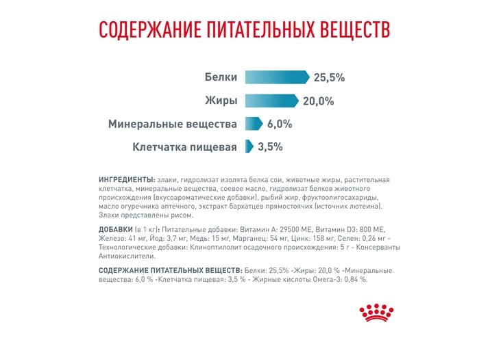 Состав ИНГРЕДИЕНТЫ Рис, гидролизат изолята белка сои, животные жиры, растительная клетчатка, минеральные вещества, соевое масло, гидролизат белков животного происхождения (вкусоароматические добавки), рыбий жир, фруктоолигосахариды, масло огуречника аптечного, экстракт бархатцев прямостоячих (источник лютеина). ДОБАВКИ (в 1 кг) Питательные добавки: Витамин A: 29500 ME, Витамин D3: 800 ME, Железо: 41 мг, Йод: 3,7 мг, Медь: 15 мг, Марганец: 54 мг, Цинк: 158 мг, Ceлeн: 0,26 мг. Технологические добавки: Клиноптилолит осадочного происхождения: 5 г - Консерванты - Антиокислители. СОДЕРЖАНИЕ ПИТАТЕЛЬНЫХ ВЕЩЕСТВ Белки: 25,5 % - Жиры: 20,0 % - Минеральные вещества: 6,0 % - Клетчатка пищевая: 3,5 % - Жирные кислоты Омега 3: 0,84 %. *L.I.P.: источники белков с высокой степенью усвояемости.