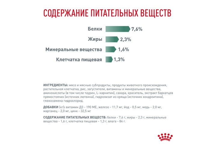 Состав ИНГРЕДИЕНТЫ Мясо и мясные субпродукты, продукты животного происхождения, растительная клетчатка, рис, загустители, витамины и минеральные вещества, аминокислоты (в том числе таурин, L-карнитин), сахара, краситель, экстракт бархатцев прямостоячих (источник лютеина), гидролизат из хряща (источник хондроитина), глюкозамина гидрохлорид. СОДЕРЖАНИЕ ПИТАТЕЛЬНЫХ ВЕЩЕСТВ (100 г) Белки - 7,6 г, жиры - 2,3 г, минеральные вещества - 1,6 г, клетчатка пищевая - 1,3 г, влага - 84 г. ДОБАВЛЕННЫЕ ВЕЩЕСТВА (в 1 кг) Витамин Д3 - 190 МЕ, железо - 11,7 мг, йод - 0,5 мг, медь - 2,0 мг, марганец - 2,0 мг, цинк - 32,5 мг. РЕКОМЕНДАЦИИ ПО КОРМЛЕНИЮ: см. таблицу. Корм готов к употреблению. Проследите, чтобы у вашего питомца всегда была свежая вода.