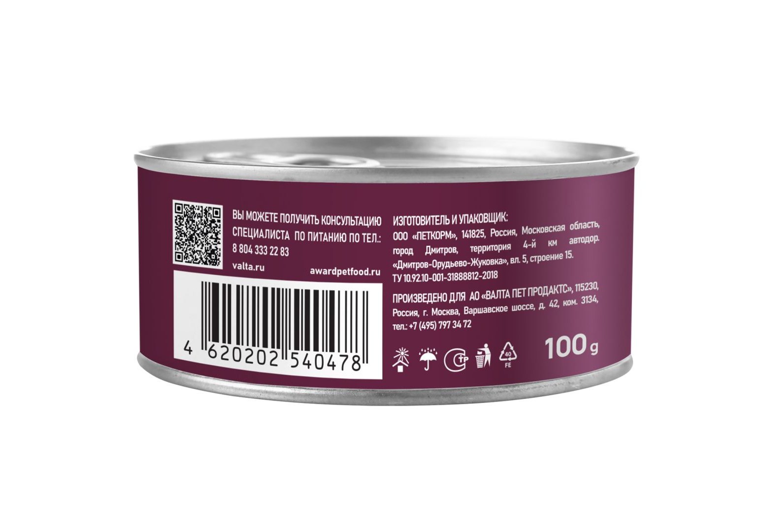 Влажный корм AWARD для взрослых кошек паштет из говядины со шпинатом 100 г.