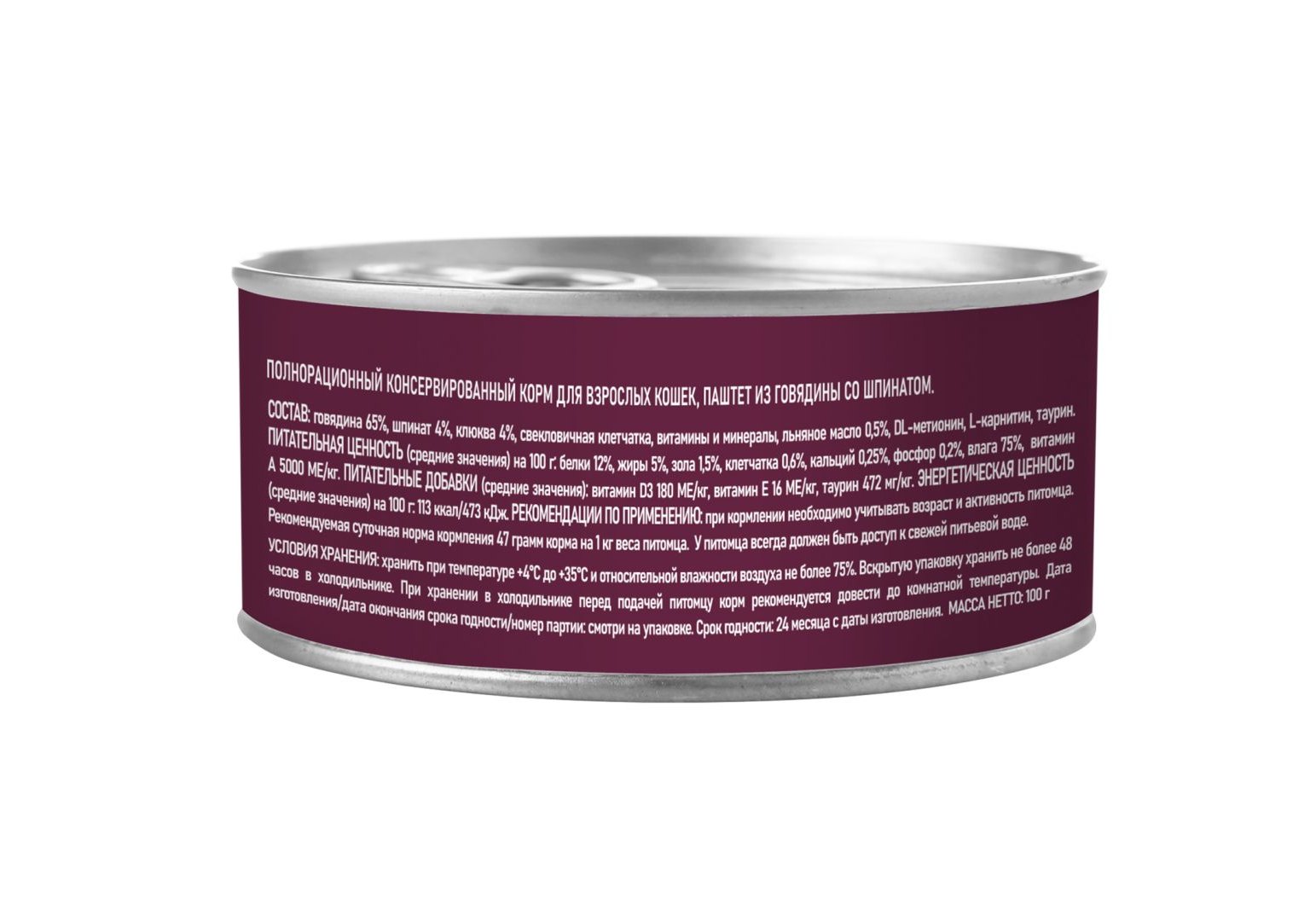 Паштет из говядины с кусочками шпината для взрослых кошек - это монопротеиновое сбалансированное питание для любимого питомца, изготовленое из одного вида мясного белка без содержания зерна и глютена, с добавлением овощей и фруктов богатых витаминами и минералами.