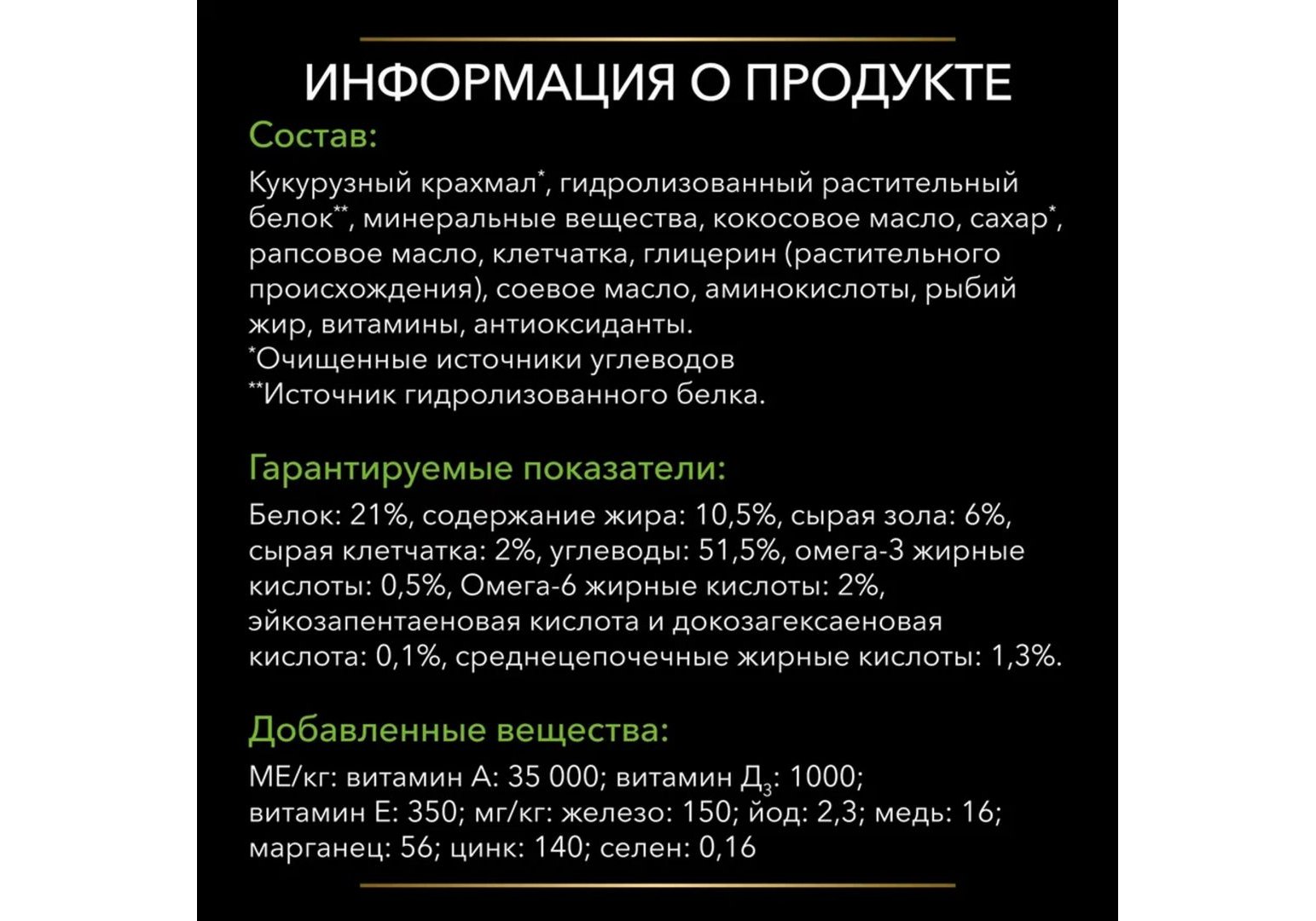 Состав Кукурузный крахмал*, гидролизованный растительный белок**, минеральные вещества, кокосовое масло, сахар*, рапсовое масло, клетчатка, глицерин (растительного происхождения), соевое масло, аминокислоты, рыбий жир, витамины, антиоксиданты. *Очищенные источники углеводов **Источник гидролизованного белка.
