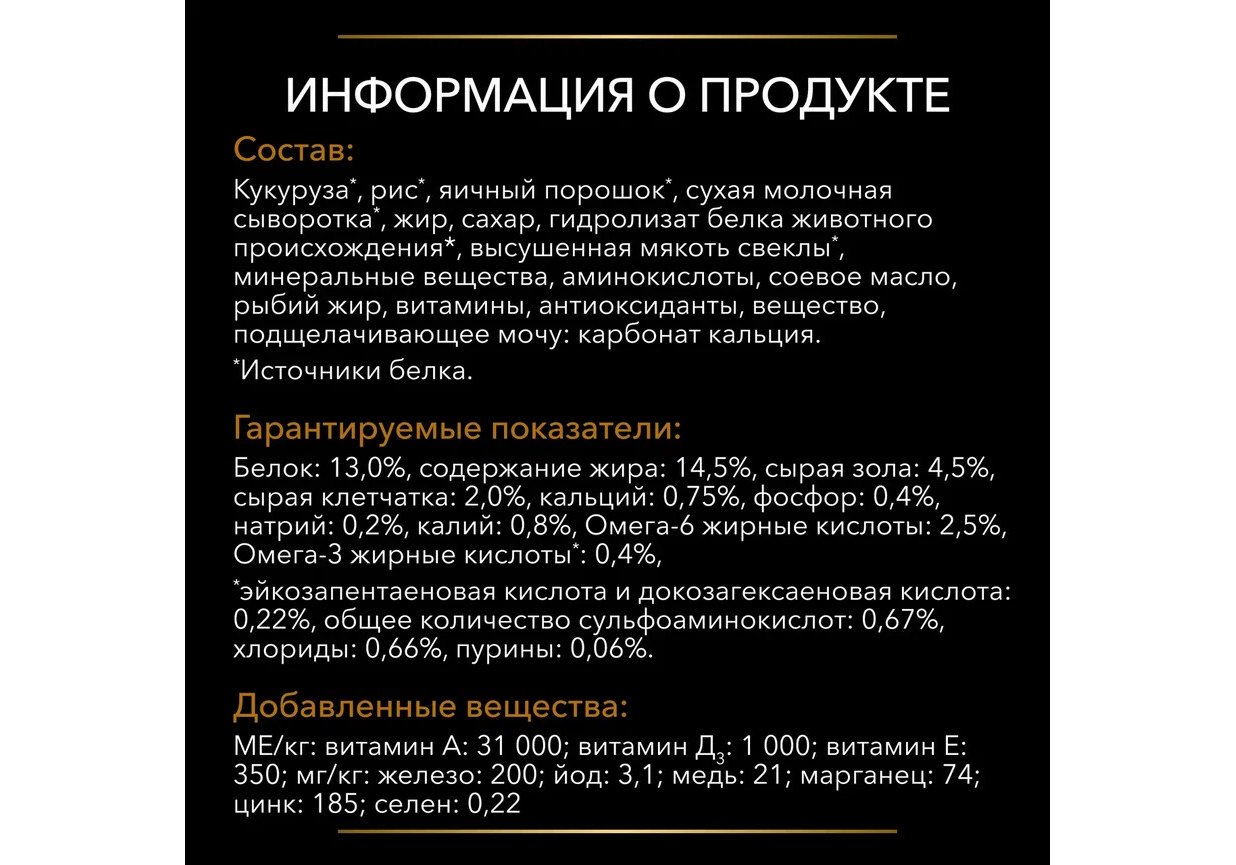 Состав Кукуруза, рис*, яичный порошок*, сухая молочная сыворотка*, животный жир, сахар, вкусоароматическая кормовая добавка*, высушенная мякоть свеклы*, минеральные вещества, аминокислоты, соевое масло, рыбий жир, витамины, антиоксиданты. Вещество, подщелачивающее мочу: карбонат кальция. * Источники белка.