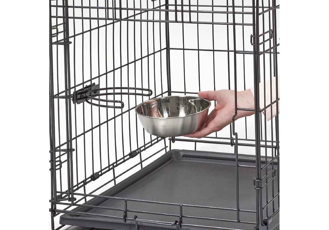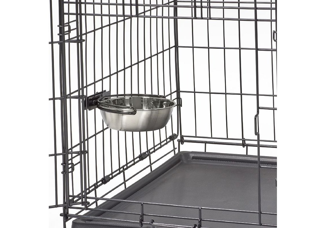 Midwest миска из нержавеющей стали на клетку. Практичная подвесная миска с держателем, для клеток и переносок. Крепежное устройство прочно фиксируется на решетку, миска легко устанавливается в держатель и не может быть извлечена или перевернута животным. Изготовлена из высококачественной нержавеющей стали. Объем миски: 600 мл. Габариты: d=15см, глубина=5 см.