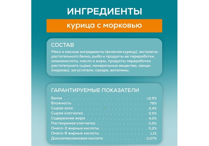 Состав Мясо и мясные ингредиенты (включая курицу), экстракты растительного белка, рыба и продукты ее переработки, масла и жиры, минеральные вещества, аминокислоты, продукты переработки растительного сырья, овощи (морковь), загустители, сахара, витамины.