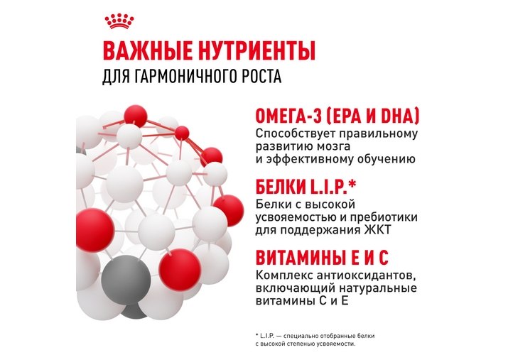 Сочетание пребиотиков и легкоусвояемых белков (L.I.P.*) поддерживает баланс микрофлоры кишечника, способствуя здоровью пищеварительной системы.