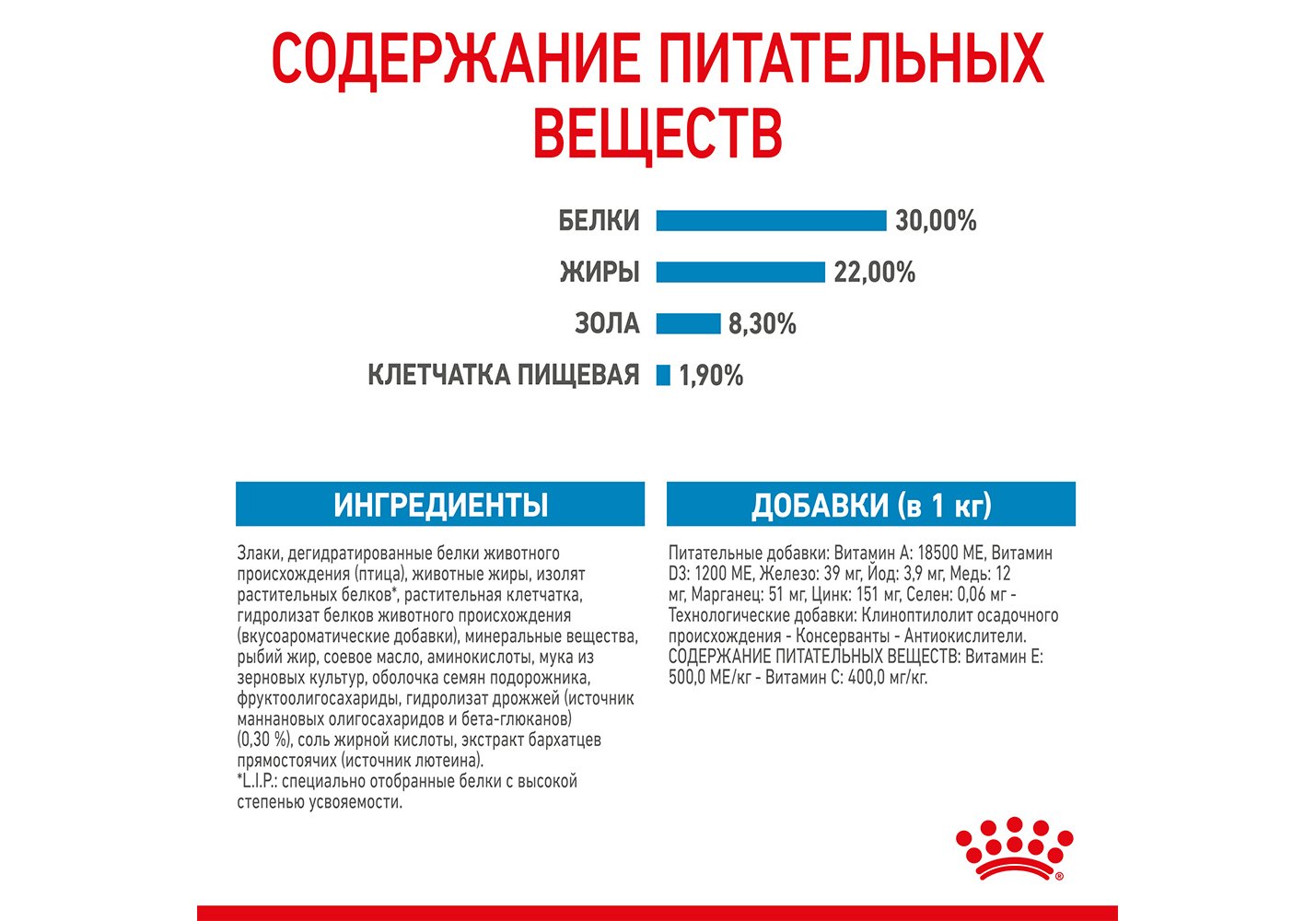 Состав ИНГРЕДИЕНТЫ Злаки, дегидратированные белки животного происхождения (птица), животные жиры, изолят растительных белков*, растительная клетчатка, гидролизат белков животного происхождения (вкусоароматические добавки), минеральные вещества, рыбий жир, соевое масло, аминокислоты, мука из зерновых культур, оболочкa семян подорожника, фруктоолигосахариды, гидролизат дрожжей (источник мaннановых олигосахаридов и бета-глюканов) (0,30 %), соль жирной кислоты, экстракт бархатцев прямостоячих (источник лютеина). ДОБАВКИ (в 1 кг) Питательные добавки: Витамин A: 18500 ME, Витамин D3: 1200 ME, Железо: 39 мг, Йод: 3,9 мг, Медь: 12 мг, Марганец: 51 мг, Цинк: 151 мг, Ceлeн: 0,06 мг - Технологические добавки: Клиноптилолит осадочного происхождения - Консерванты - Антиокислители. СОДЕРЖАНИЕ ПИТАТЕЛЬНЫХ ВЕЩЕСТВ Белки: 30,0% - Жиры: 22,0% - Зола: 8,3% - Клетчатка пищевая: 1,9% - Витамин E: 500,0 ME/кг - Витамин C: 400,0 мг/кг. *L.I.P.: специально отобранные белки с высокой степенью усвояемости. Информация об ингредиентах и нутриентном составе на сайте является справочной. Вся информация о продукте представлена непосредственно на упаковке.