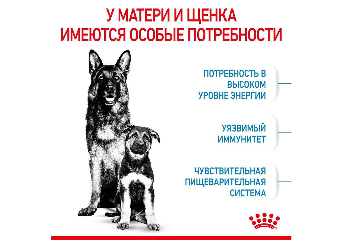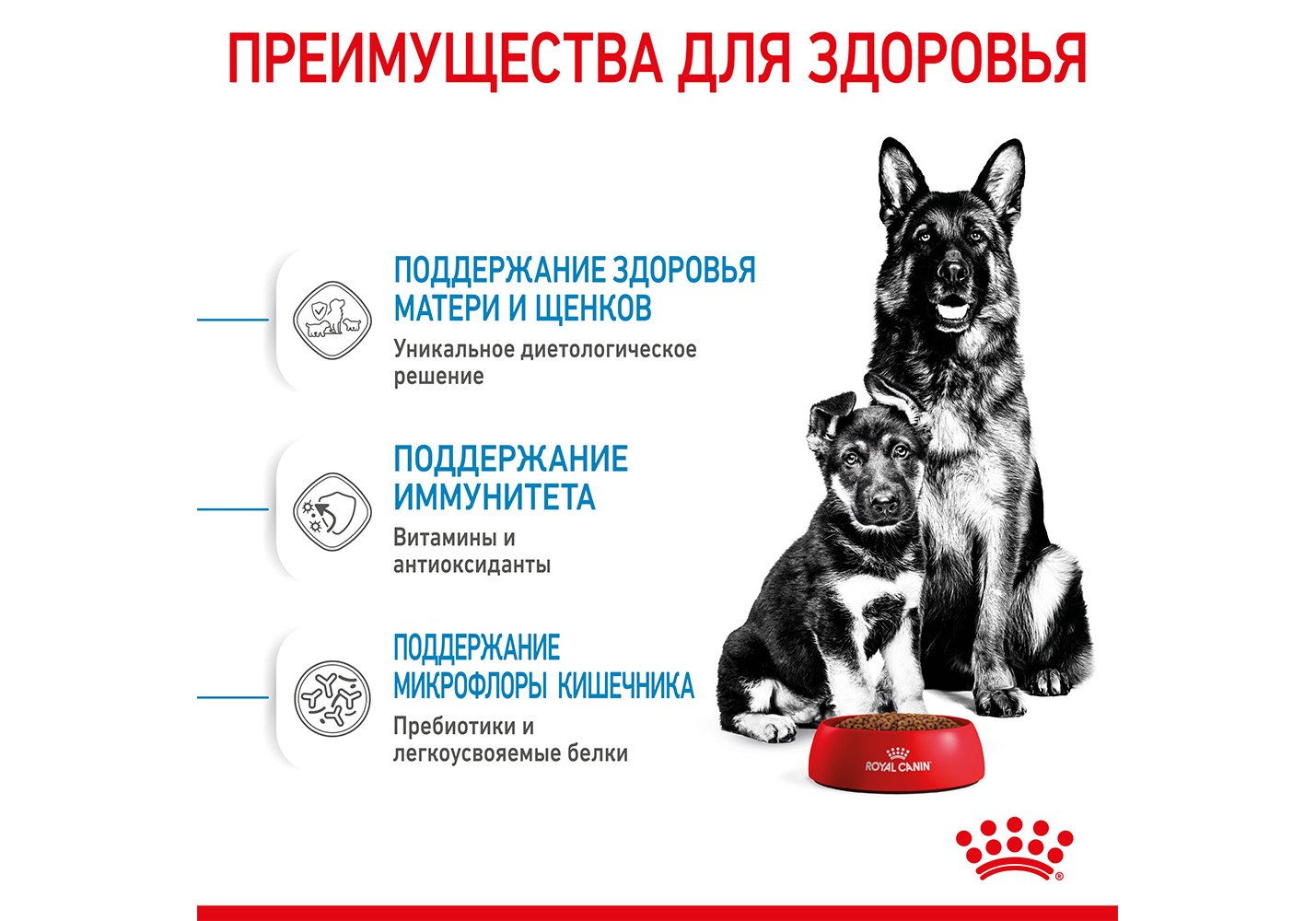 Специально разработанный рацион удовлетворяет высокие энергетические потребности матери крупных размеров, а также поддерживает здоровое развитие щенков, в том числе щенков из больших пометов.