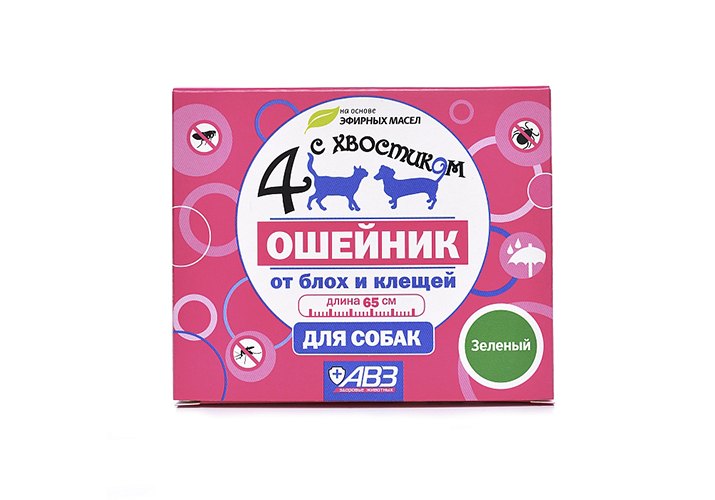ЧЕТЫРЕ С ХВОСТИКОМ ошейник репеллентный от блох и клещей для собак, 65 см(зелёный). ПРЕИМУЩЕСТВА: Содержит только натуральные природные действующие вещества. Надежно защищает от большого спектра насекомых и клещей, паразитирующих на собаках. Выбор размеров для животных разных пород. Оказывает длительный репеллентный эффект. СОСТАВ и основные свойства: В качестве действующих веществ композицию эфирных масел лаванды, цитронеллы, мяты перечной, герани и эвкалипта. Ошейник выпускают в форме свернутой полимерной ленты длиной 65 см (для крупных собак), 50 см ( для средних собак), 35 см (для мелких собак), в герметично закрытом бумажном пакете, упакованным в картонную пачку. Эфирные масла лаванды, цитронеллы, мяты перечной, герани и эвкалипта обладают репеллентным действием в отношении иксодовых и чесоточных клещей, блох, вшей и власоедов, паразитирующих у собак. Входящая в СОСТАВ ошейника композиция эфирных масел постепенно выделяясь с поверхности полимерной ленты не всасывается в системный кровоток, накапливается в сальных железах тела животного, оказывая отпугивающее действие на насекомых и клещей. Ошейник «Четыре с хвостиком» хорошо переносится собаками разных пород и возрастов. Подходит для больных и ослабленных животных, а также для беременных и кормящих самок. ПОКАЗАНИЯ К ПРИМЕНЕНИЮ: Ошейник репеллентный «Четыре с хвостиком» применяют собакам для защиты от блох, вшей, власоедов, комаров, иксодовых и чесоточных клещей. После вскрытия упаковки ошейник надевают на животное, подгоняя по размеру так, чтобы между шеей и ошейником оставался промежуток в 1 см, затем пропускают свободный конец ленты через фиксатор, а излишек ленты отрезают, оставляя конец 1,5-2 см. Непрерывное ношение ошейника обеспечивает защиту собак от насекомых до 3-х мес., клещей не менее 4-х недель. При сильной степени поражения животного насекомыми, перед применением ошейника, животное рекомендуется вымыть зоошампунем «Луговой», а подстилки обработать спреем «БАРС» или «БАРС форте». Ошейник «Четыре с хвостиком» не следует применять щенкам моложе 2-х месячного возраста.