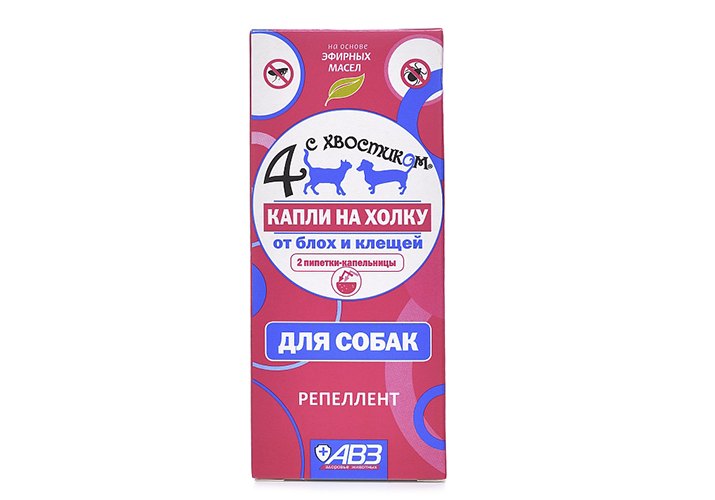 ЧЕТЫРЕ С ХВОСТИКОМ капли репеллентные от блох и клещей для собак, 2 пипетки. ПРЕИМУЩЕСТВА: Содержат смесь натуральных природных эфирных масел; Надежно предохраняют животных от нападения большого спектра насекомых и клещей, паразитирующих на собаках; Совершенно безопасны для использования. СОСТАВ и свойства: В своем СОСТАВе капли на холку «Четыре с хвостиком» содержат смесь эфирных масел лаванды (2%), цитронеллы (2%), шизандры (2%). Капли представляют собой прозрачную маслянистую жидкость светло-желтого цвета со специфическим ароматическим запахом. Эфирные масла лаванды, цитронеллы и шизандры, входящие в СОСТАВ капель обладают выраженным репеллентным действием на вшей, блох, власоедов, иксодовых и саркоптоидных клещей, паразитирующих у собак. Продолжительность отпугивающего действия после однократной обработки животного СОСТАВляет против иксодовых клещей до 3-х недель, против блох до 8-ми недель. Капли репеллентные на холку «Четыре с хвостиком» в рекомендуемых дозах не оказывают местно-раздражающего, резорбтивно-токсического и сенси- билизирующего действия. ПОКАЗАНИЯ К ПРИМЕНЕНИЮ: Собакам для предупреждения энтомозов, саркоптозов, нотоэдроза и поражений иксодовыми клещами. Капли, раздвинув шерсть, наносят на кожу вдоль позвоночника в несколько точек в области спины между лопатками, головы и у основания хвоста. Собаки от 2 до 10 кг - 1 пипетка; от 10 до 20 кг - 2 пипетки; более 20 кг - 3-4 пипетки. Повторные обработки проводят по показаниям.